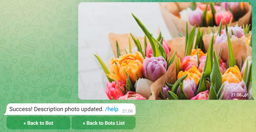 Готово! Вы получите текст об успешном добавлении описания чат бота.