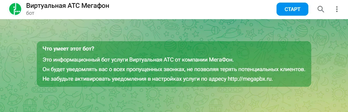 Например, «МегаФон» описывает, что бот уведомит пользователя о пропущенных звонках, и указывает на преимущество услуги — пригодится, чтобы не терять клиентов. Дополнительно компания предупреждает, что ещё нужно сделать для корректной работы чат-бота.