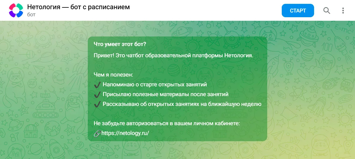 А вот пара примеров использования эмодзи. В «Нетологии» с их помощью оформили функции чат-бота как список.