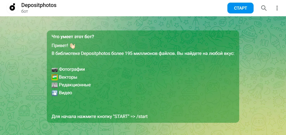 В описании чат-бота Depositphotos для создания списка используются тематические эмодзи.