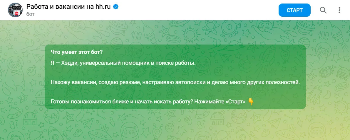 В чат-боте hh.ru тоже описано, чем он полезен пользователю. Обратите внимание — компания сделала описание бота от его лица. Вы тоже можете написать что-то подобное, чтобы «очеловечить» своего чат-бота.