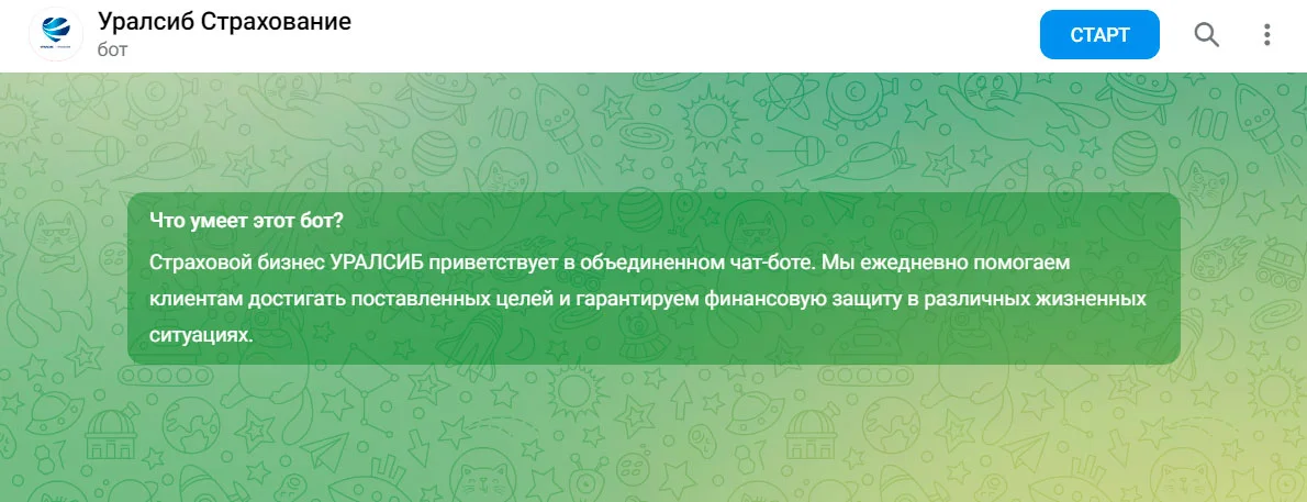 Например, банк «Уралсиб» приветствует пользователей, а после пишет о себе. Но при этом в описании не хватает информации о том, что, собственно, умеет делать чат-бот.
