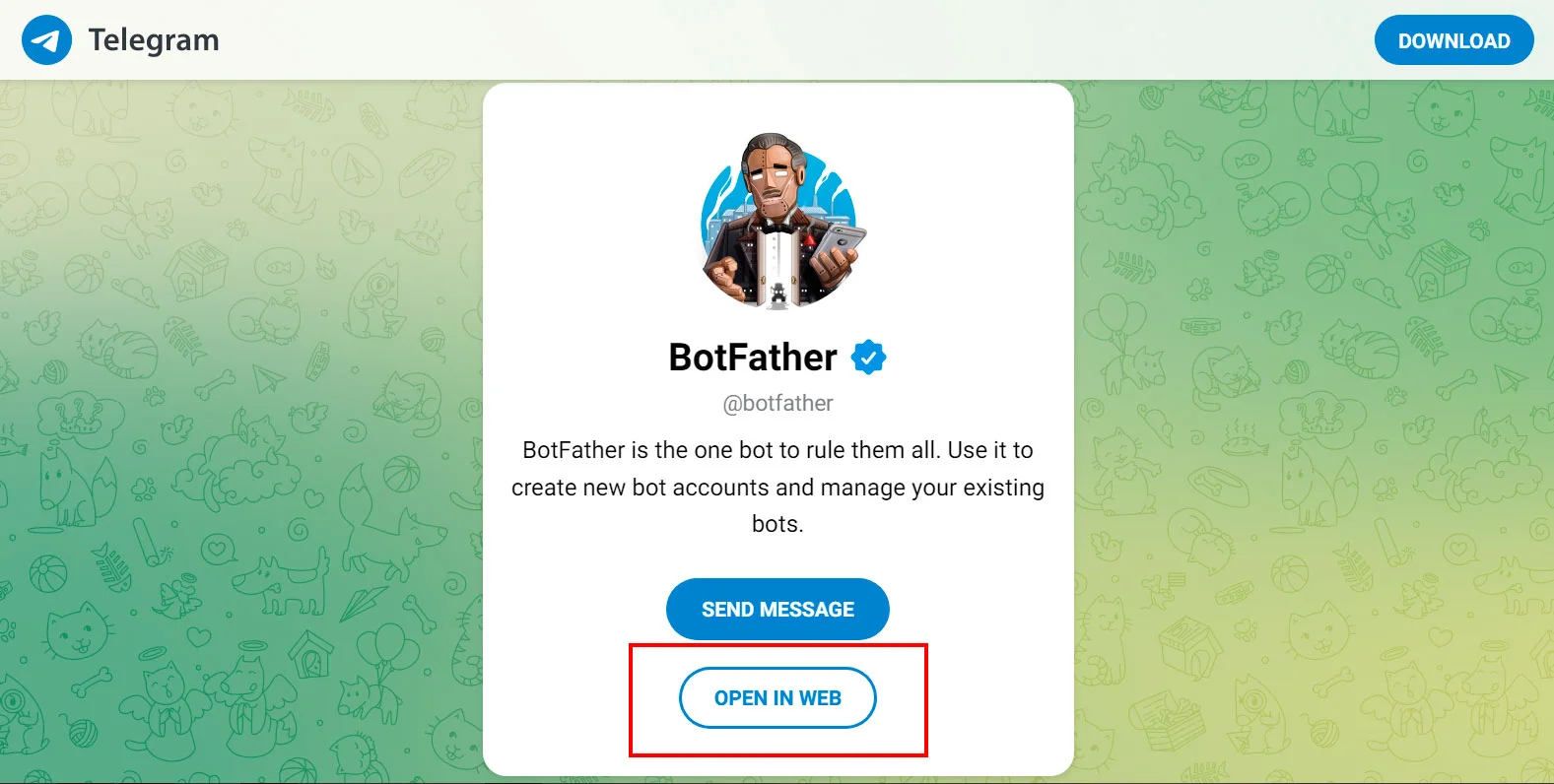 Перейдите в BotFather по этой ссылке. Если пользуетесь веб-версией мессенджера, нажмите «Open in Web».