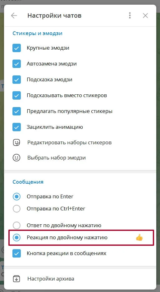 Как сменить быструю реакцию на ПК. Перейдите в «Настройки» → «Настройки чатов» → кликните на Emoji в строке «Реакция по двойному нажатию» и выберите нужное.