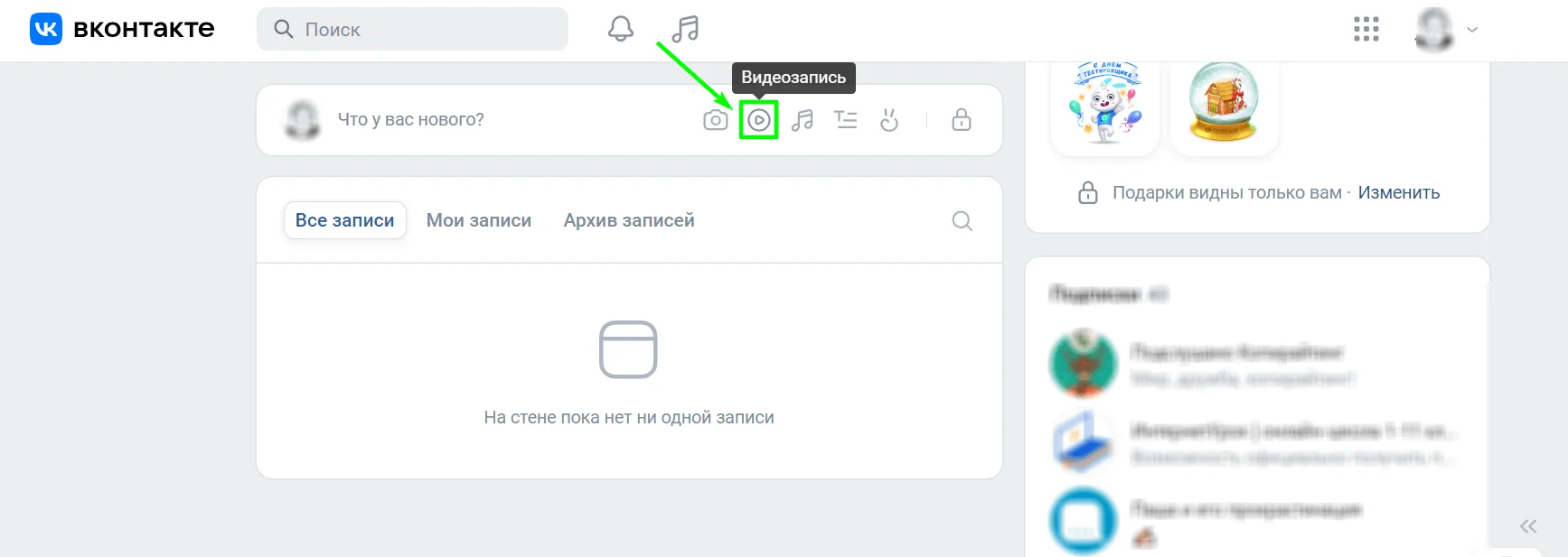 1. Авторизуйтесь в своём аккаунте и на своей странице загрузите видеозапись.