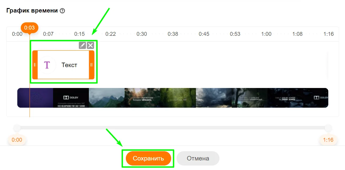 5. В разделе «График времени» под видеозаписью отобразится блок с добавленной подписью. Вы можете перетащить блок или растянуть на нужный временной период.