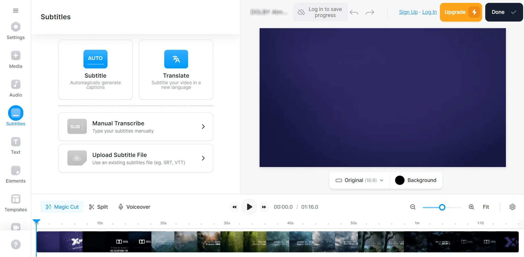 VEED — онлайн-студия редактирования видео, которая работает с Windows, Mac и на всех мобильных устройствах. Здесь можно ввести субтитры вручную, загрузить файл с текстом, автоматически сгенерировать подписи, перевести сабы на другой язык.