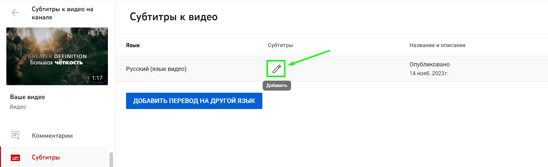 4. В таблице справа в столбце «Субтитры» при наведении курсора появится значок карандаша, по которому нужно кликнуть.