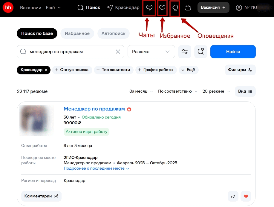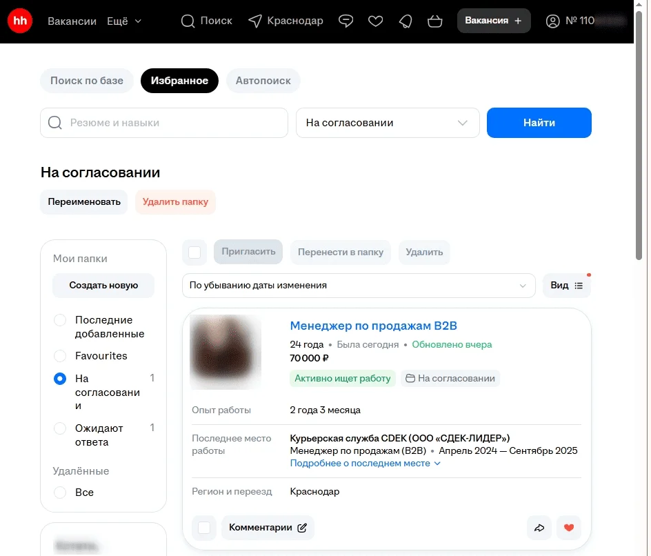 Избранное. Здесь находятся сохраненные работодателем резюме. Их можно сортировать по папкам, например: «Ожидают ответа» или «Рассмотреть позже». Так резюме специалистов не будут теряться среди десятков анкет.