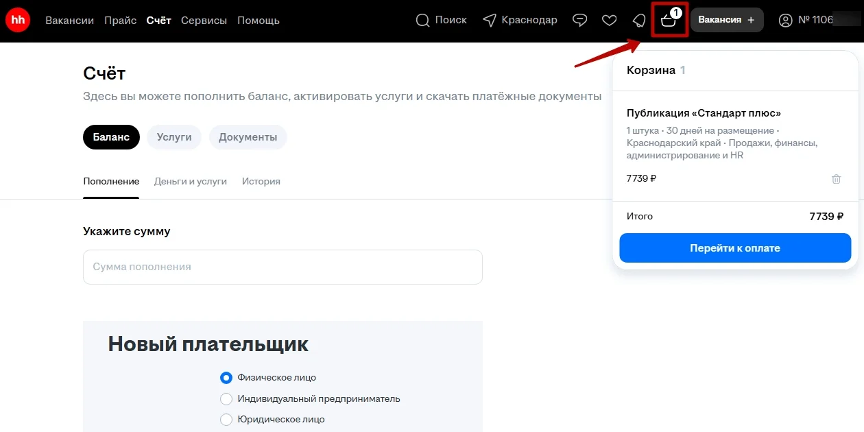Корзина покупок. Здесь находится список выбранных услуг: размещение вакансий, доступ к базе резюме, продвижение и другие функции. В этом разделе можно посмотреть стоимость и оформить оплату.
