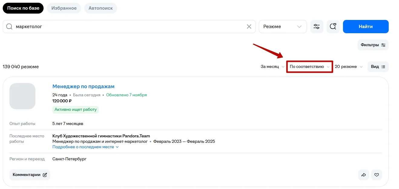 Для этого нужно перейти в раздел «Поиск» и ввести параметры вакансии. К примеру, должность, формат работы и диапазон зарплаты. В настройках нужно указать поиск «по соответствию». Система подберет резюме, которые могут напрямую не совпадать с названием вакансии, но соответствовать по требуемому опыту кандидата.