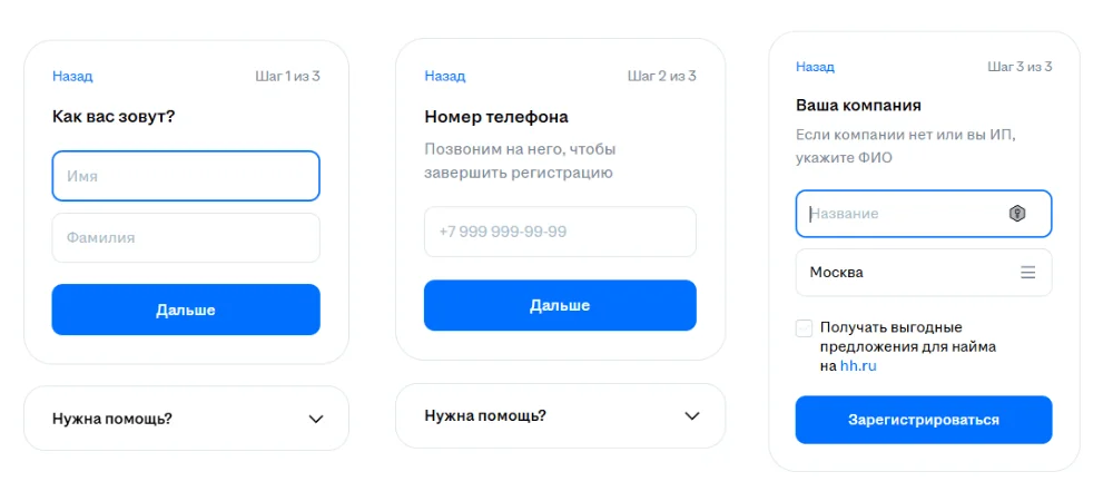 Эти сведения будут использоваться для создания профиля работодателя. После заполнения анкеты система предложит подтвердить почту или телефон. После этого можно переходить к настройке личного кабинета.