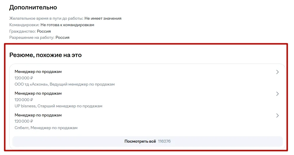 Поиск по «похожим профилям». Когда работодатель нашел одного подходящего кандидата, система автоматически подбирает других соискателей с аналогичным опытом, образованием и навыками. Это ускоряет процесс подбора и помогает сформировать пул потенциальных кандидатов без дополнительных запросов.