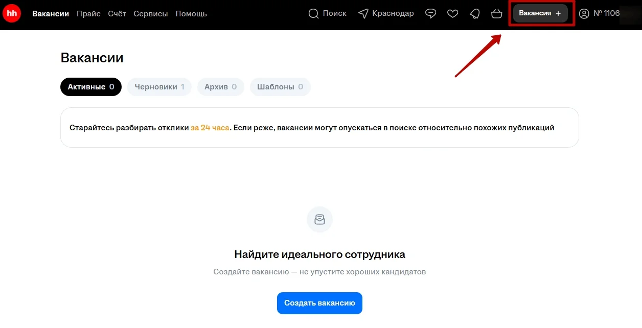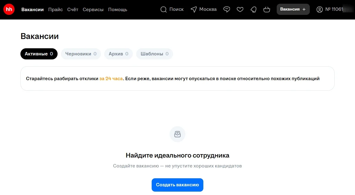 В верхней части отображаются вкладки: «Активные», «Черновики», «Архив» и «Шаблоны». На странице есть подсказка о том, что отклики стоит просматривать в течение 24 часов, иначе вакансия будет опускаться в поисковой выдаче. Также в верхнем интерфейсе можно воспользоваться кнопкой для создания вакансии.