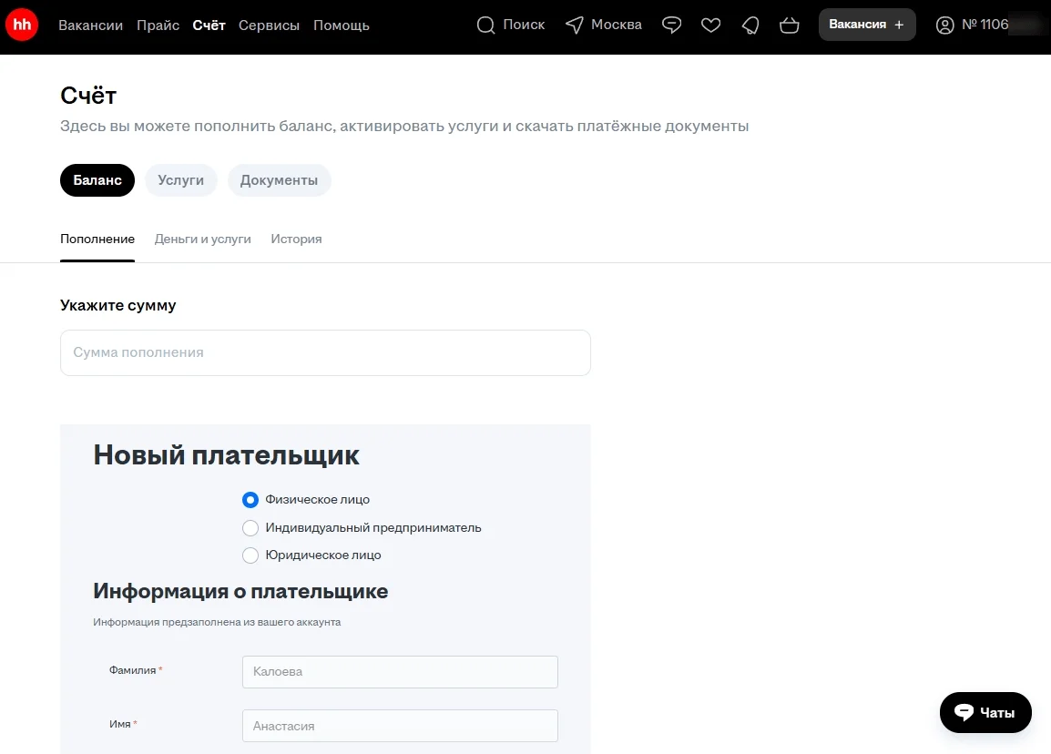 Счет. Здесь работодатель может пополнить баланс, оплатить размещения вакансий, скачать закрывающие документы и посмотреть историю транзакций. На этапе оплаты нужно выбрать тип плательщика: физическое лицо, ИП или юридическое лицо.
