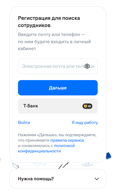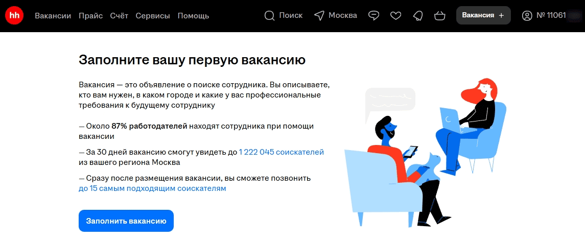 Работодатель заполняет карточку вакансии: указывает должность, требования, обязанности, условия работы и размер оплаты. После публикации вакансия появится в поисковом поле, где соискатели могут откликнуться.