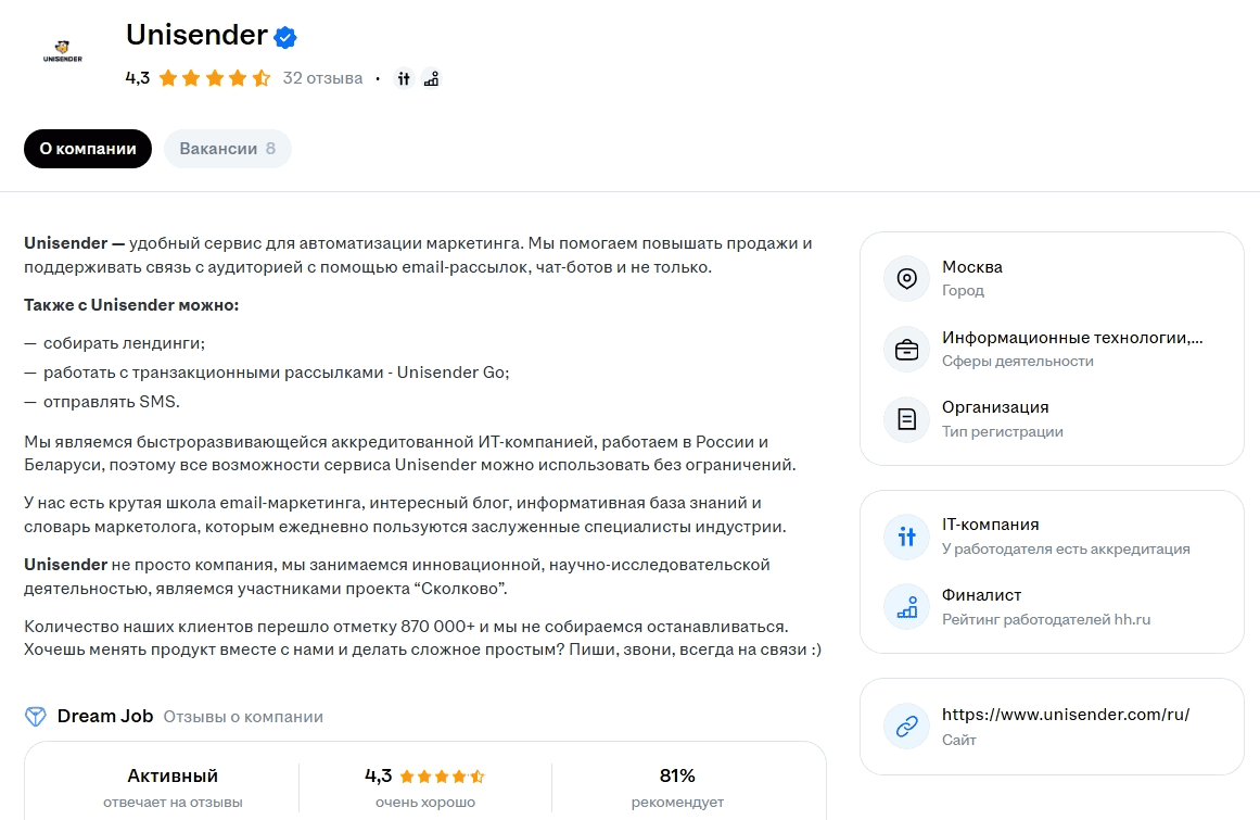 На этой странице кандидат знакомится с профилем работодателя перед откликом на вакансию. Здесь отображается информация о деятельности и достижениях компании, особенностях корпоративной культуры. На странице можно добавить фотографии офиса, рассказать о преимуществах работы. Это помогает сформировать доверие и выделиться среди конкурентов. Пустой профиль может создать впечатление ненадежной компании.