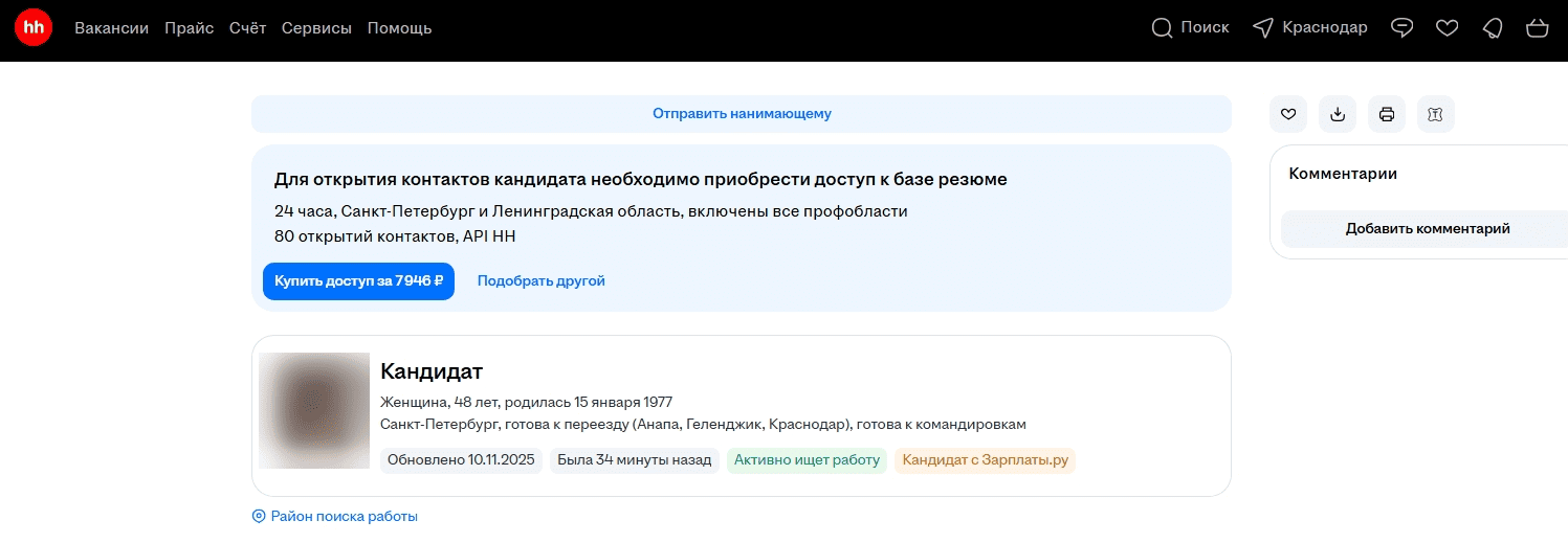 Поиск и просмотр списка соискателей доступен бесплатно всем работодателям. Но чтобы открыть контакты кандидата, нужен платный доступ к базе. Он выдается на ограниченное время, например, на сутки, неделю или месяц. Стоимость зависит от длительности доступа, регионов поиска и количества выбранных профессиональных областей.