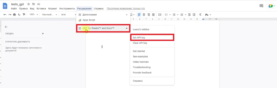 После этого для вызова ChatGPT в документе понадобится только запустить расширение. В правой части экрана появится меню расширения для работы с ChatGPT.