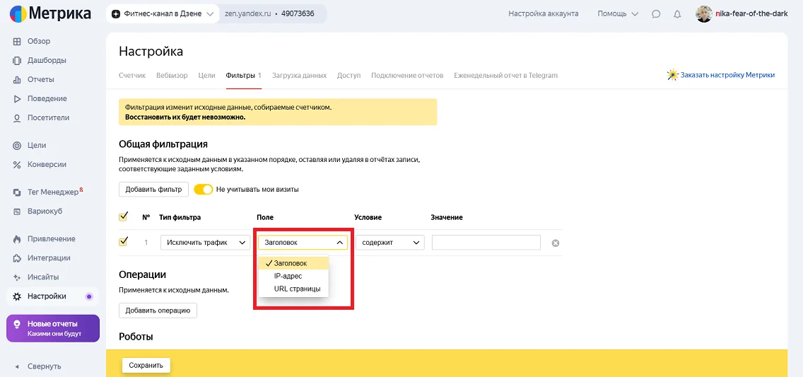 Чтобы настроить фильтр, в разделе «Фильтры» выберите условие «Заголовок страницы», впишите нужное значение (полный заголовок или часть текста) и сохраните. После этого Метрика будет учитывать только нужные страницы по title.