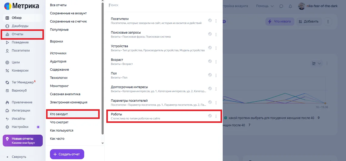 После активации фильтра Метрика начнет собирать данные по всем визитам с признаками роботов в отдельный отчет. Он находится в списке всех отчетов, в разделе «Кто заходит — Роботы».