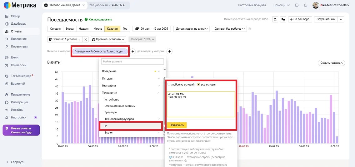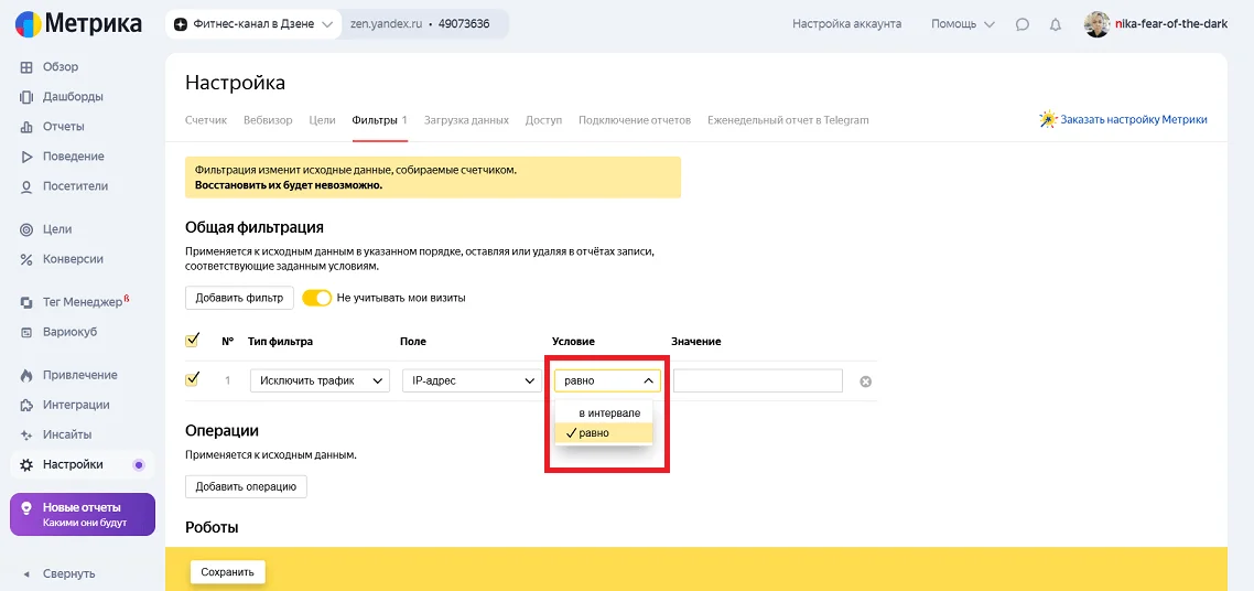 Условие. Выберите «Равно», если нужно отфильтровать визиты с одного IP-адреса, или «В интервале», если хотите исключить переходы с нескольких адресов.