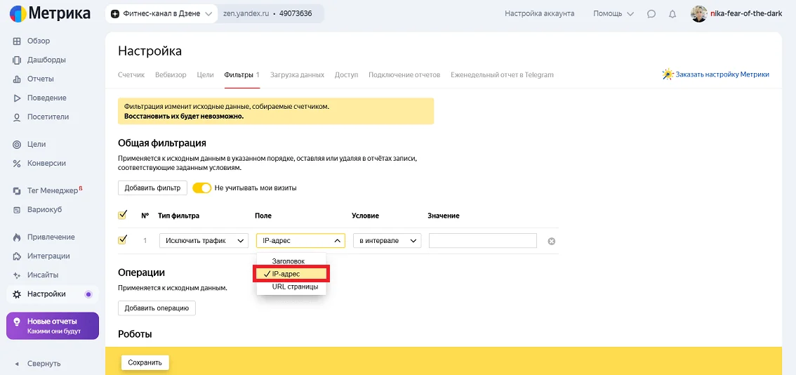 После настройки фильтра нажмите на кнопку «Сохранить», и Метрика перестанет фиксировать переходы с указанных IP-адресов.