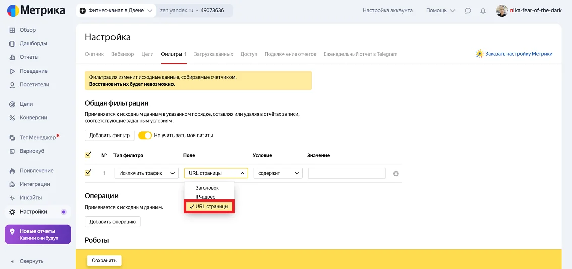 В окошке «Значение» укажите полный URL или часть адреса страницы, которую хотите исключить или включить, и сохраните изменения. После в отчеты будут попадать данные только по нужным страницам.