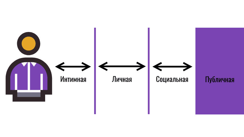 Расположение в пространстве. Это расстояние между собеседниками. Слишком близкое может вызвать дискомфорт, слишком большое ― создать ощущение дистанции. Выделяют следующие зоны: