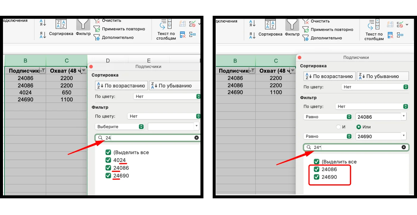 Без подстановочных знаков фильтрация покажет все значения, содержащие «24» — нужное сочетание может стоять в конце, в начале и в середине. А вот с символами подстановки в фильтре можно прописать 24* и получить нужный результат. Все, что начинается на 24, окажется в выдаче.