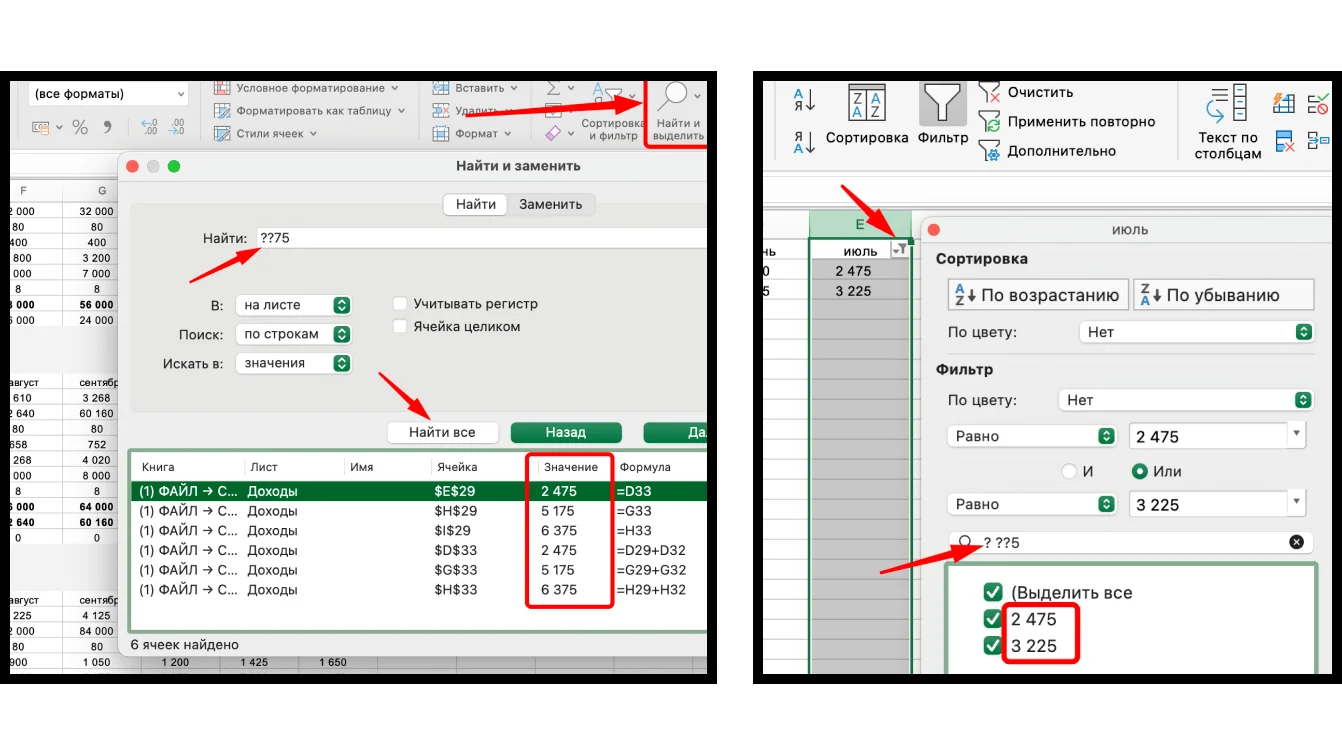 А если работаете с номерами, где важны последние цифры, используйте знак вопроса. Например, с комбинацией «????45» получится найти всё, что заканчивается на «45» и перед этим содержит ровно 4 символа. Поиск чисел сработает как через функцию «найти и выделить», так и через «фильтр».
