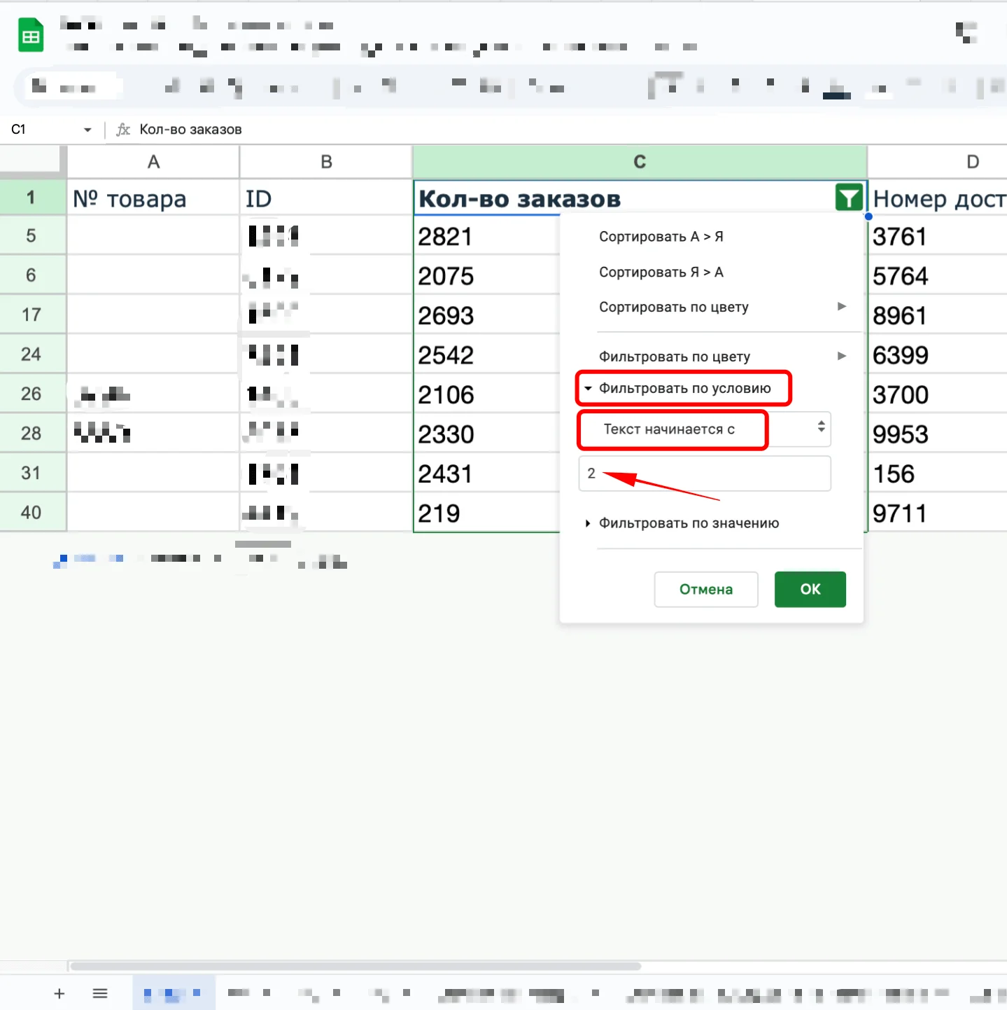 Во-вторых, подстановочные знаки не распознаются в режиме фильтрации. Google Таблицы позволяют фильтровать данные по условию и значению. Например, можно выбрать «Фильтровать по условию» → «Текст начинается с». Это будет равно фильтрации с астериском на конце в Excel, где мы бы ввели «2*».