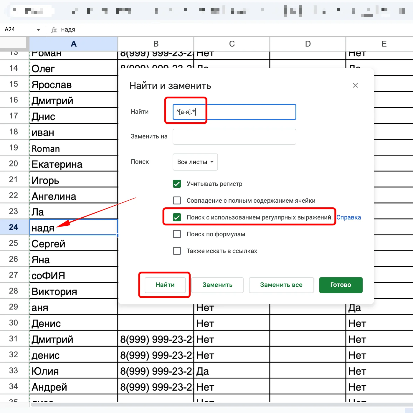 В результате нашего поиска по фамилиям мы найдем ячейки, содержащие слова с маленькой буквы. Например, имена вроде андрей, алексей, мАКС, алеНа.