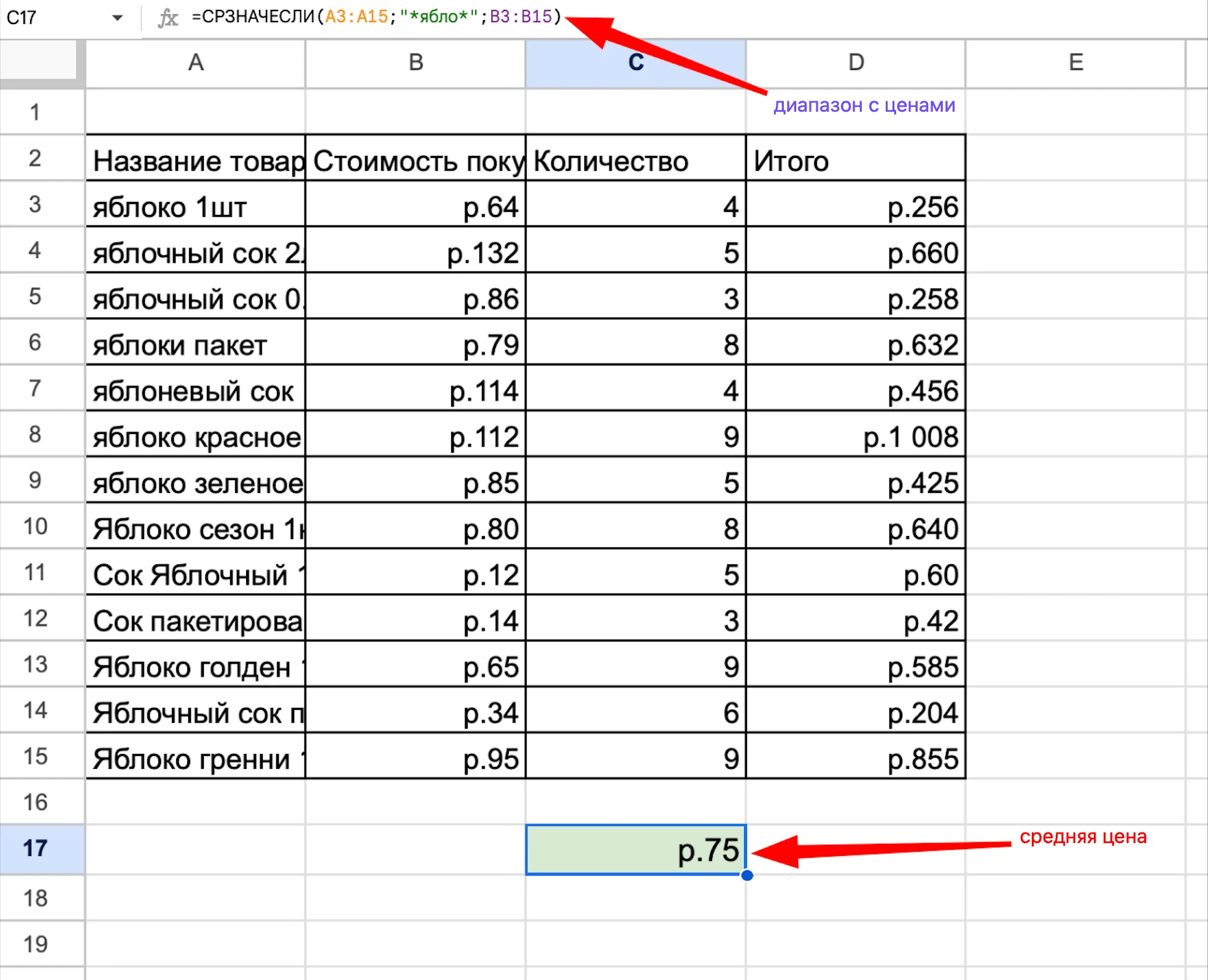 Например, чтобы подсчитать среднюю цену по всем товарам с «яблоком» в названии, можно использовать формулу: