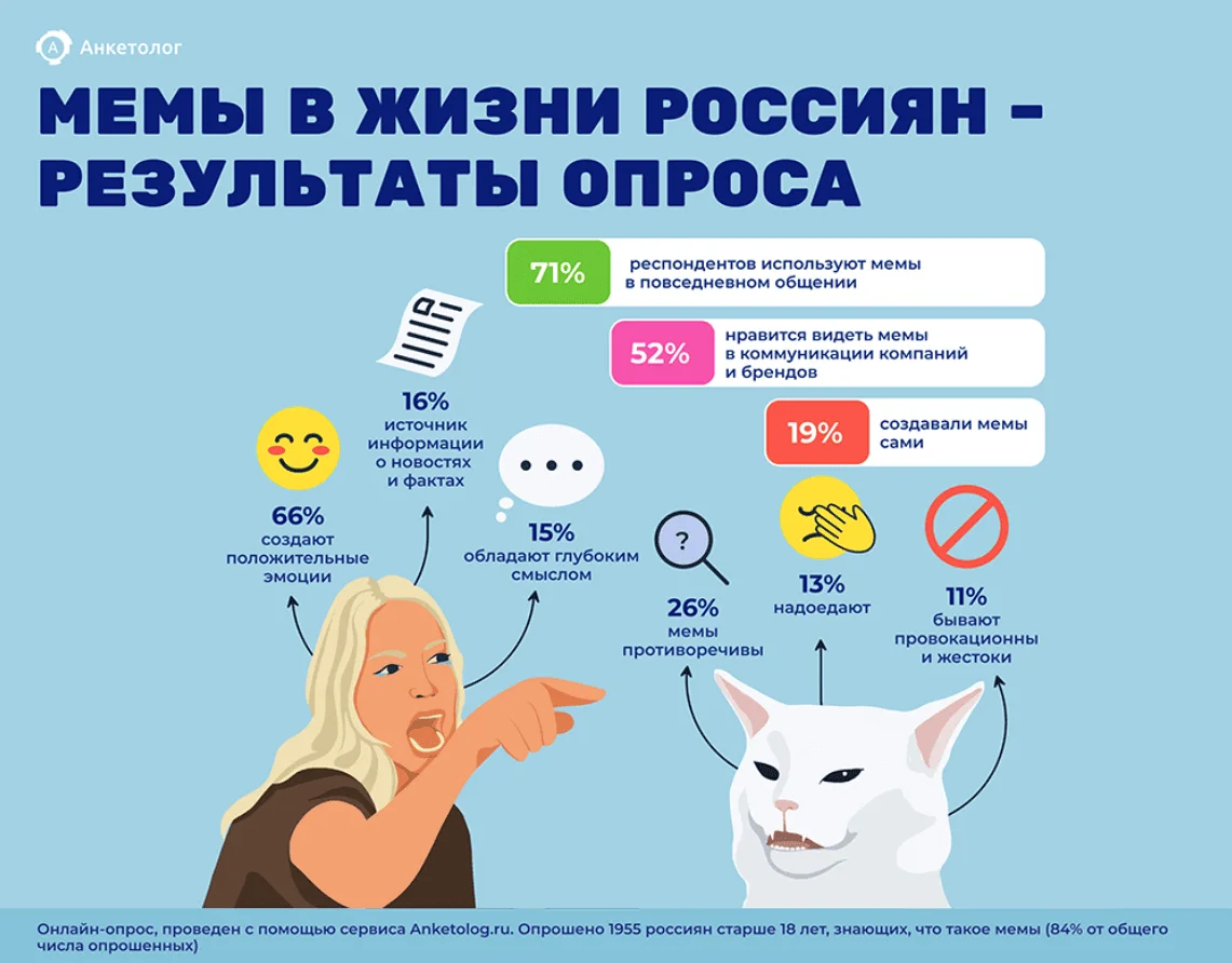 Если вы используете чужие мемы, лучше убедиться в наличии достаточных прав на их коммерческое использование. В идеале желательно найти автора и попросить разрешения. Если это невозможно, укажите ссылку на оригинальную публикацию.
