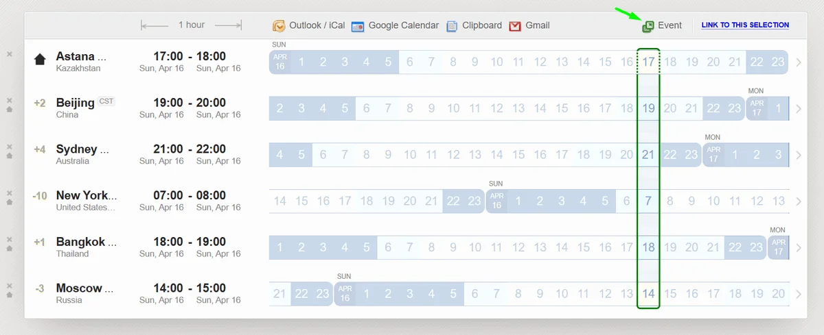 Похожим образом работает программа World Time Buddy. Здесь можно сравнить часовые пояса коллег, выбрать подходящее время, создать страницу события и публично ею поделиться. Созданное событие каждый участник мероприятия сможет сразу добавить в свой Google Календарь.