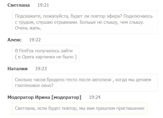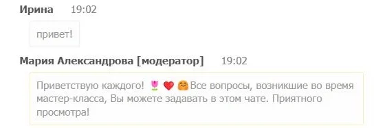 Ещё до начала эфира модератор помогает создать дружественную атмосферу в чате: предлагает участникам представиться, сообщить о вопросах, с которыми пришли, напоминает о правилах поведения и уважении к присутствующим.