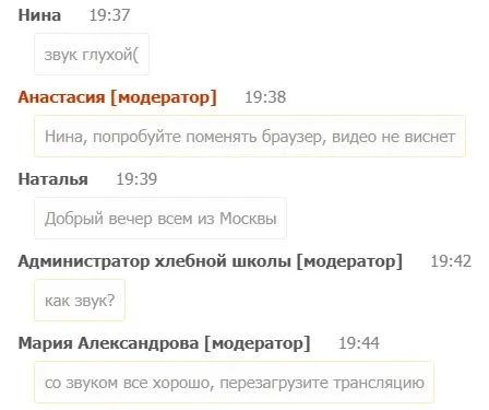 Если людей много, чат может превратиться в непрерывную бегущую строку, и это не позволит спикеру быстро реагировать на вопросы. Тогда модератору придется передавать нужную информацию спикеру в личные сообщения. В моей практике была ситуация, когда у эксперта имелись только камера и микрофон. Чат он не видел, поэтому я направляла вопросы зрителей в личные сообщения в Telegram.