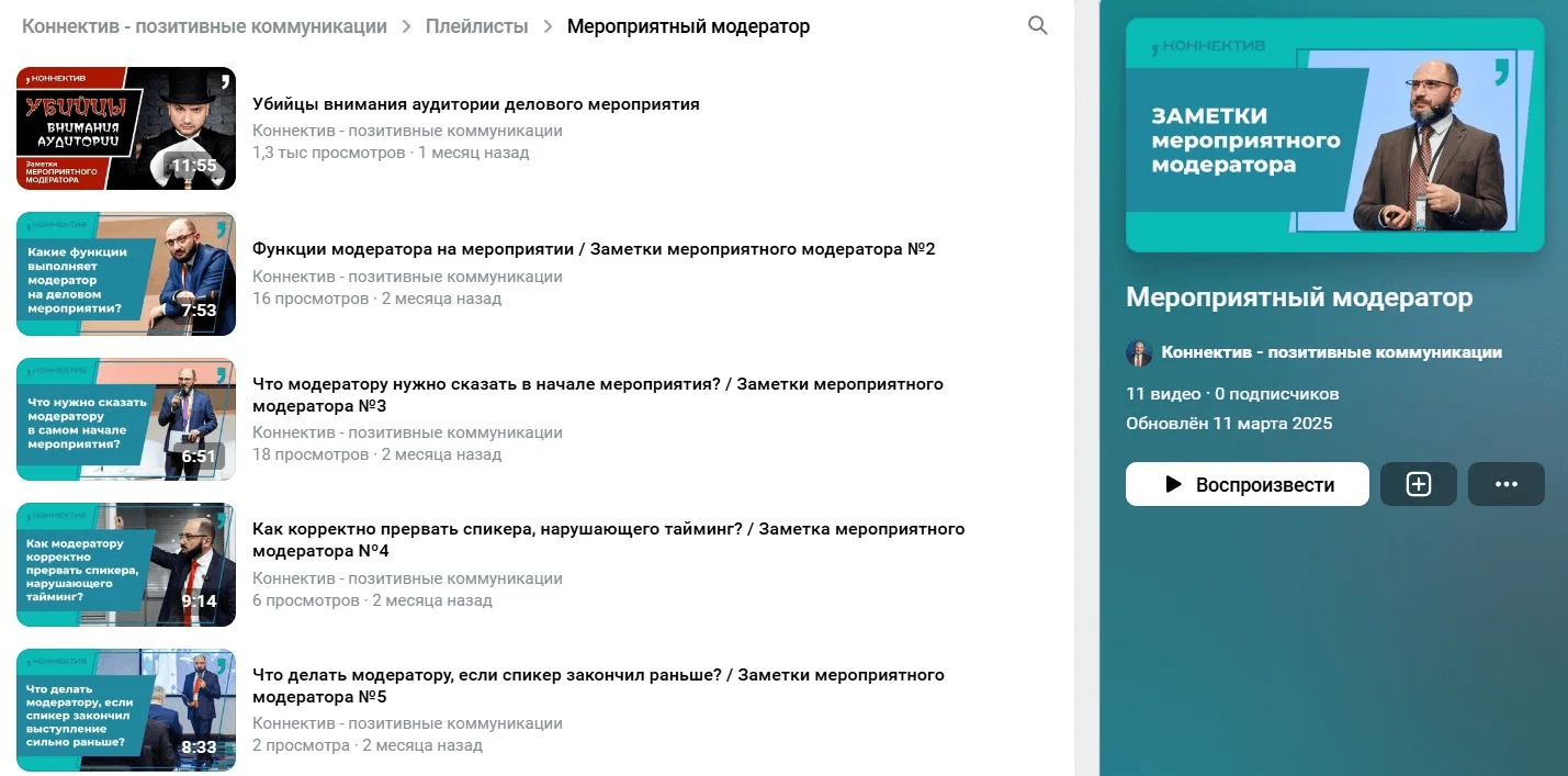 Рекомендации по модерации деловых мероприятий от Григория можно посмотреть в плейлисте «Заметки мероприятного модератора». Там ― о нюансах и сложностях, которые могут возникнуть. Например, как корректно прервать спикера, нарушающего тайминг, что делать модератору, если спикер закончил раньше, что модератору говорить в начале мероприятия: