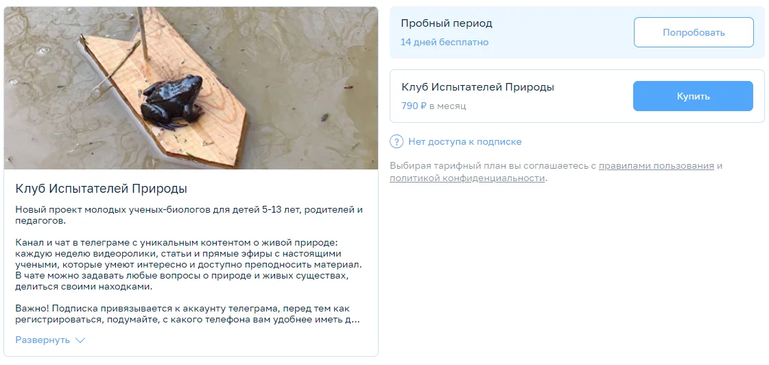 Кстати, клуб «Испытатели природы» использует и предыдущий способ — дают пробный доступ на две недели, чтобы подписчики могли познакомиться с контентом.