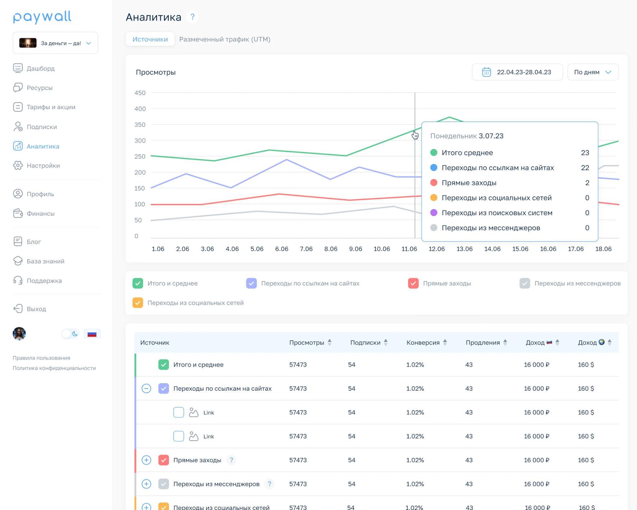 Для открытого канала можно пользоваться TGStat, однако для закрытых нужно искать другое решение. Когда я вела свой канал, то сначала никак не отслеживала статистику. Чуть позже обратила внимание, что в Paywall есть отдельная страница с аналитикой, где можно отследить источники переходов на канал, подключить Яндекс Метрику или ВК Пиксель, а также получить все сводки по финансам. Удобно.