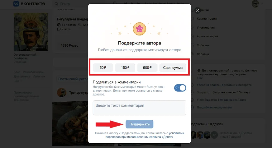 Размер разового доната определяют пользователи — после клика по кнопке «Поддержать автора» можно выбрать сумму, которая спишется с банковской карты или VK Pay.