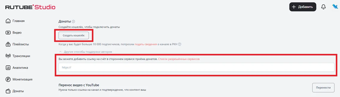 С каждого доната RUTUBE удерживает комиссию 10%. Деньги можно выводить в любое время, но если сумма меньше 3000 ₽, платформа дополнительно удержит 50 ₽. Изучите страницу с описанием донатов, чтобы детально разобраться в этом способе монетизации.