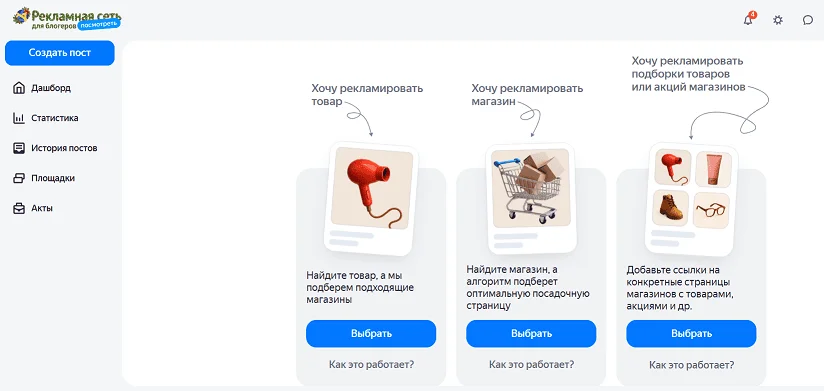 Чтобы зарабатывать на сообществе ВКонтакте через РСЯ, нужно зарегистрироваться в системе и успешно пройти модерацию. Далее — выбрать на дашборде предмет рекламы (конкретный товар, подборку или интернет-магазин) и сгенерировать первый пост.