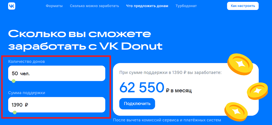 Размер регулярных донатов устанавливает владелец сообщества. На странице с описанием VK Donut можно даже спрогнозировать чистую прибыль от платных подписчиков.