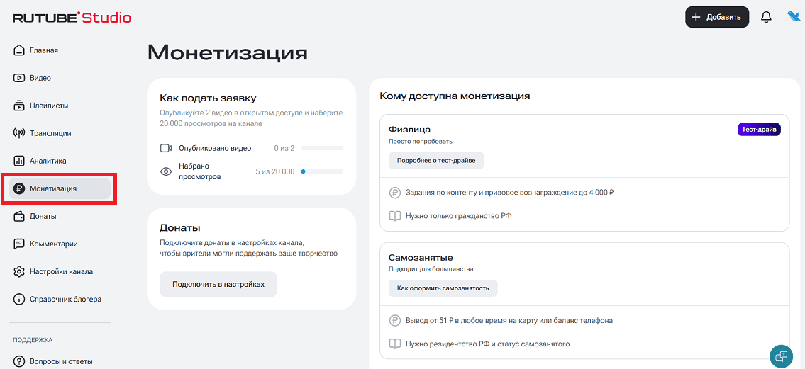 Внутренняя монетизация станет доступна, когда вы опубликуете на канале два видео и наберете от 20 000 просмотров. Заявку можно подать через Студию Rutube в разделе «Монетизация» (потребуется авторизация).