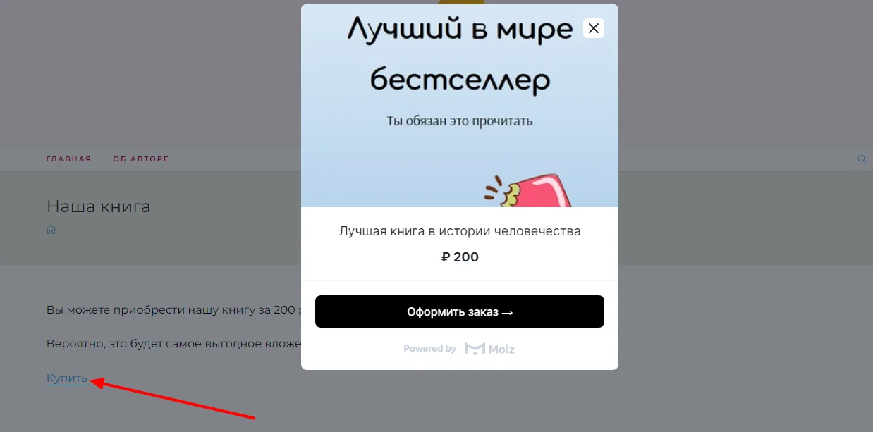 Molz. Это сервис для продажи цифровых товаров. После создания карточки генерируется код, который можно разместить на сайте. Выглядит как обычная ссылка, но при нажатии появляется всплывающее окно с формой заказа.