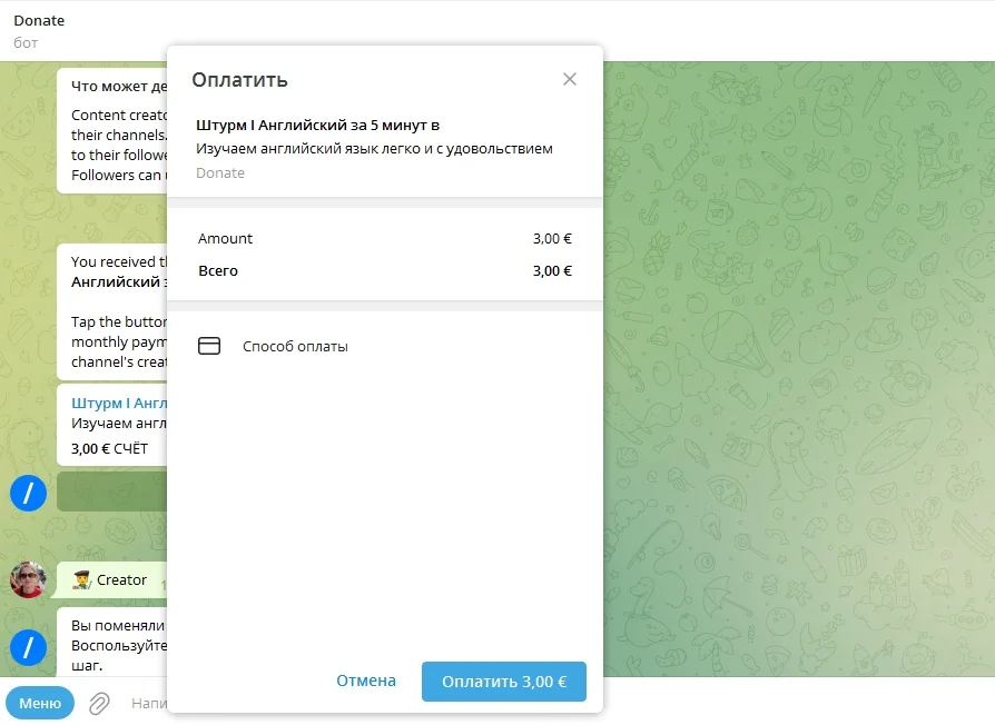При нажатии на кнопку «Присоединиться» пользователь попадет в чат с тем же ботом @donate, где ему предложат оплатить подписку.