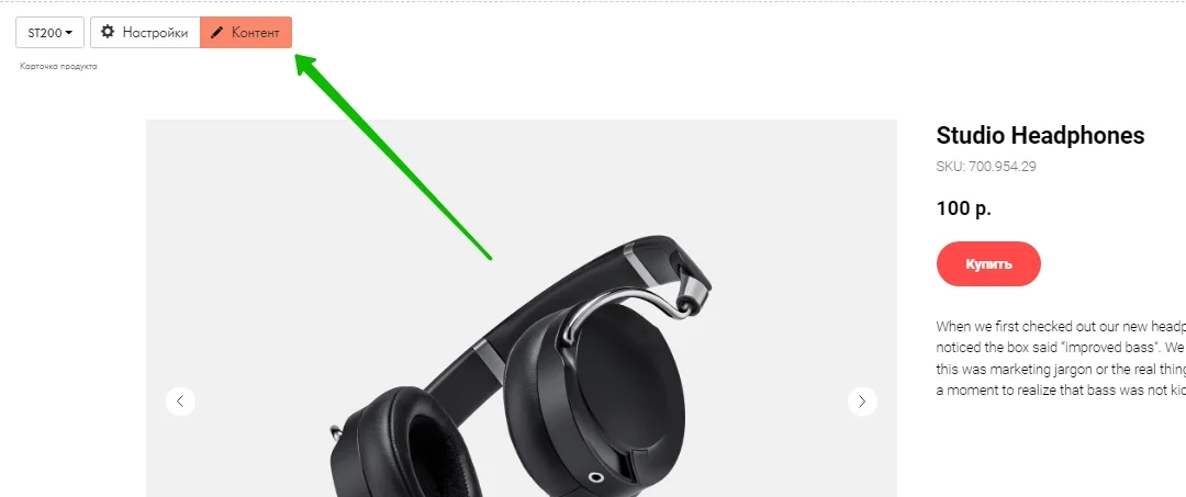 Теперь необходимо отредактировать содержимое. Для этого нажмите на кнопку «Контент» в верхней части блока.