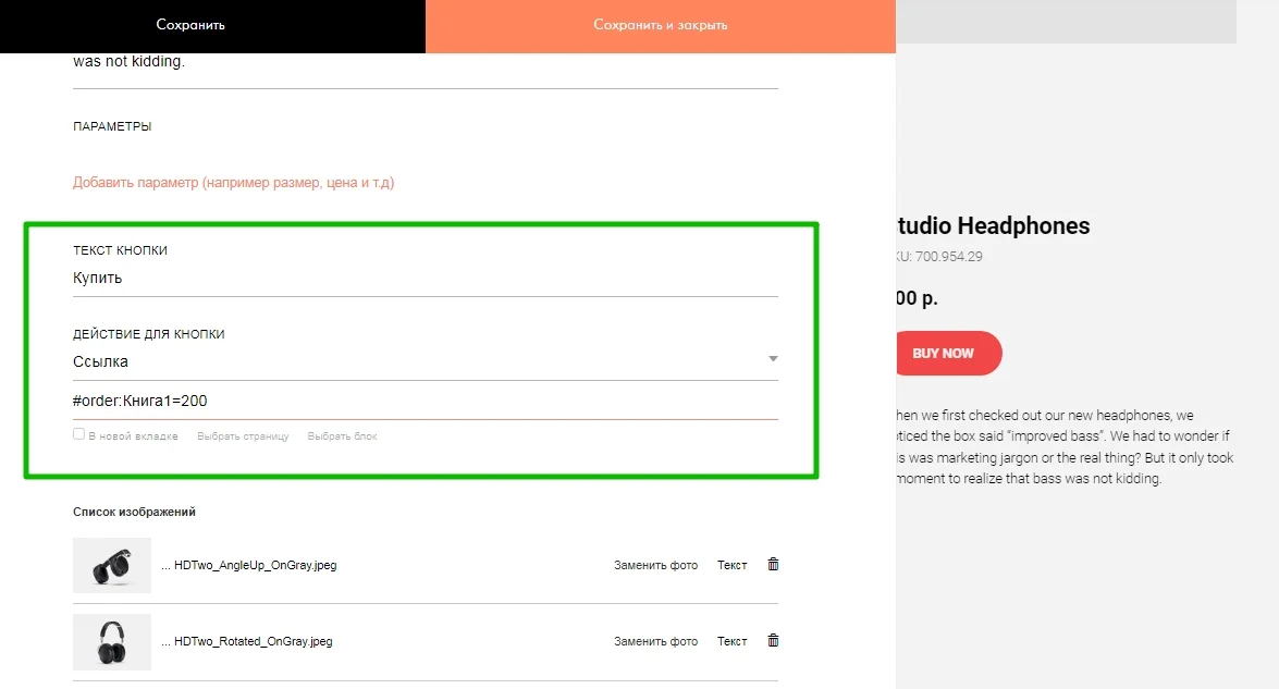 Спуститесь ниже до текста кнопки, поменяйте его на свой и добавьте ссылку для оплаты. Ссылка должна быть указана в формате #order:название товара=цена. Пример — на скриншоте ниже: